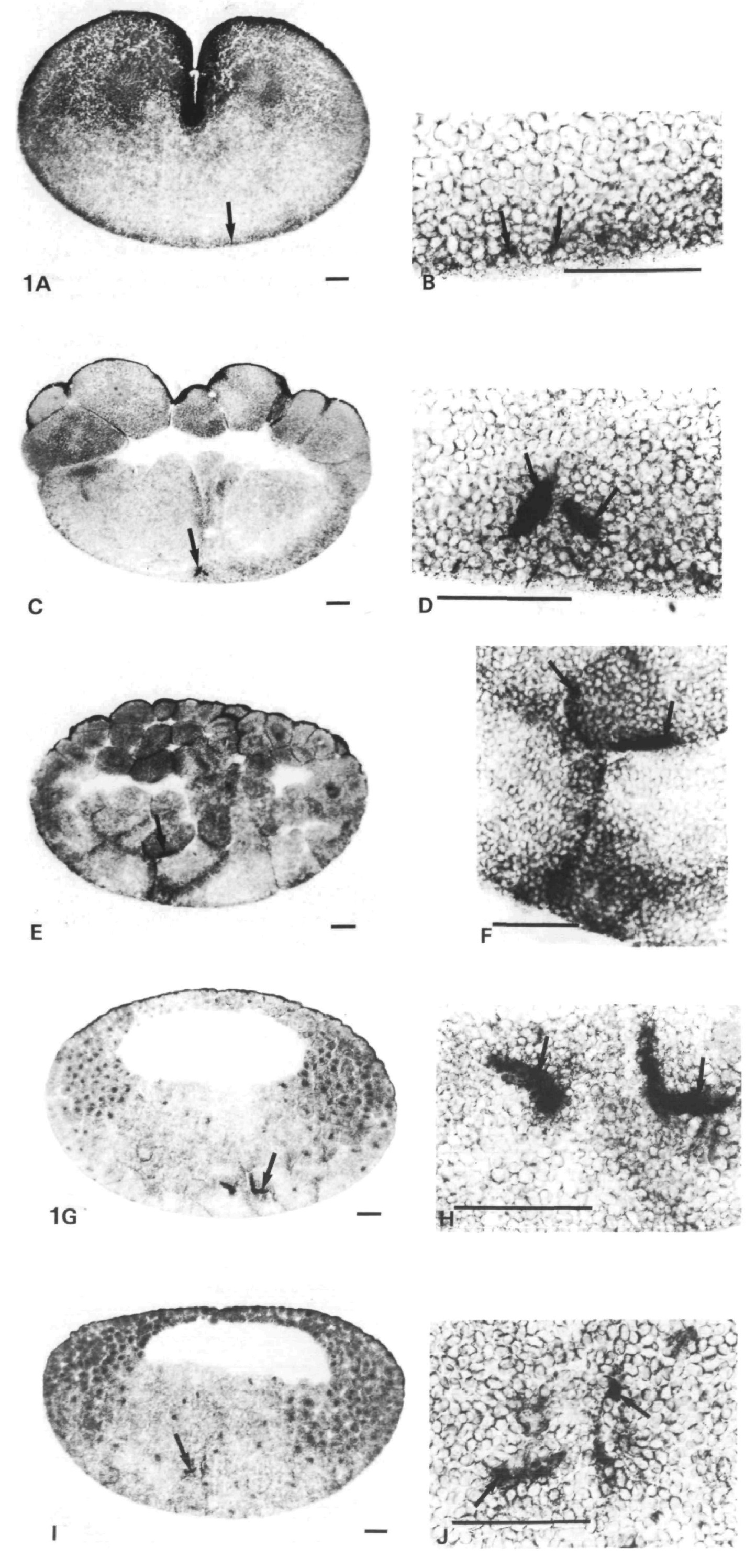 Patches of germ plasm (arrows). (A,B) 2h p.f.; (C,D) 4h p.f.; (E,F) 6h p.f.; (G,H) 8h p.f.; (I,J) 10H p.f. Bars,