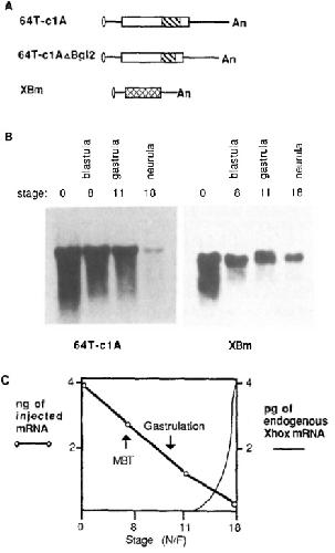 (B) Northern blot analysis of RNA from embryos injected with either 64T-clA or XBm RNA extracted at different stages of development. The injected RNAs were detected on Northern filters with nick-translated Xhox-IA or globin DNA probes. Stages are those specified by Nieuwkoop and Faber (1956).