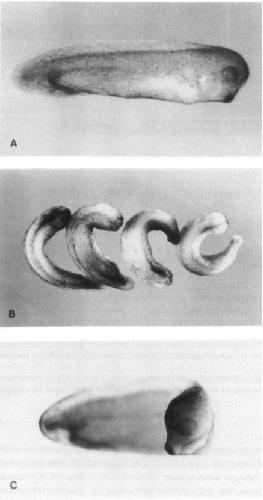 (A) Normal embryo. (f3) Dorsal view of a group of Xhox-1A injected embryos showing various examples of the kinked external phenotype. (C) Lateral view of a Xhox-IA injected and kinked embryo.