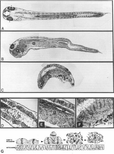 Figure 4. Histological Examination of Normal and Xhox-IA Injected Embryos at the Tailbud Stage (A) Horizontal section of a normal embryo at the level of the notochord and spinal chord. (8) Horizontal section of a Xhox-IA injected embryo at the level of the spinal chord and brain. (C) Horizontal section of a severely kinked and stunted Xhox-IA injected embryo at the level of the brain and notochord. (0) A 2.5x enlargement of a part of the normal embryo shown in (A). (E) A 2.5x enlargement of a part of the Xhox-IA injected embryo in (8) showing the loss of somite units in the lower or injected side. (F) A 2.5x enlargement of a part of the Xhox-1A injected embryo in (C) showing the somite-like units interdigitated between the notochord-proximalsomites on the lower or injected side (see text). (G) Diagram of the differences in the severity of the Xhox-1A phenotypes from normal on the left to totally chaotic on the right. B is the brain, E is the eye, EV is the ear vesicle, NC is the notochord, S is the somitic mesoderm, and SC IS the spinal cord.