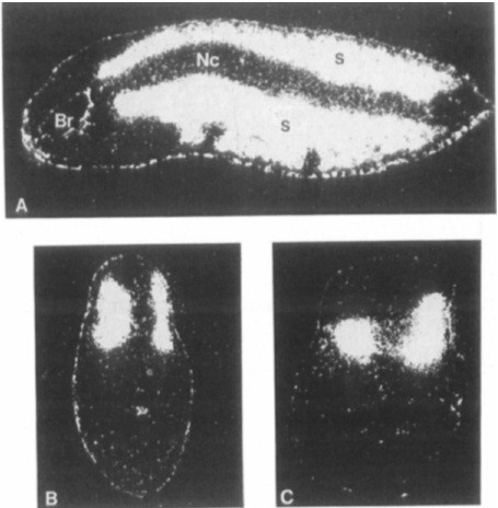 Figure 5. In Situ Hybridization to Xhox-IA Injected Embryos Using a Muscle-Specific a-Actin Probe (A) Horizontal sectron of Xhox-1A embryos viewed with dark field op- tics. Hybridization grains are seen as white. The embryo is outlined in pigment granules which also appear as white grains in these photo- graphs The normal or uninjected side of the embryo is uppermost. Note the two patches of hybridization-negative cells on the lower side of the disturbed tissue. Br is the brain, NC is the notochord, and S is the somitic mesoderm. (8) and (C). Transverse sections of Xhox-IA in- jected embryos viewed with dark field optics. Disturbed tissue is on the left side of each case. Note the asymmetry in the shape of each pair.