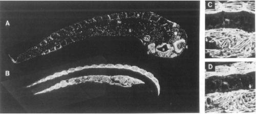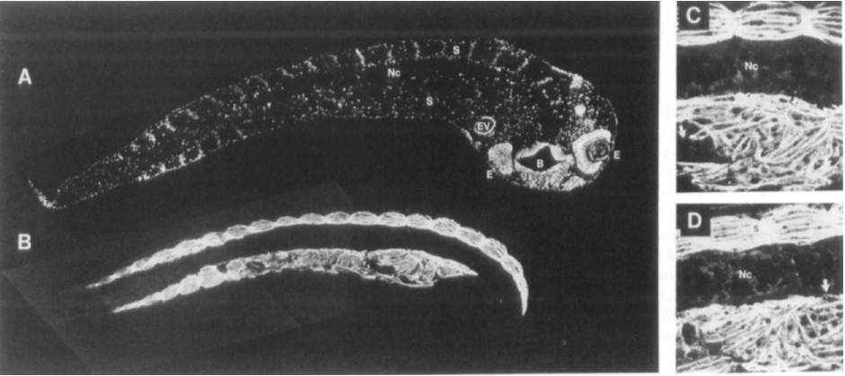 (A) Horizontal section of a Xhox-1A injected embryo stained with DAPI nuclear stain. Note the aligned nuclei in each normal somite in the upper, umnjected side of the embryo, and in the posterior region of the lower, injected side. Nuclei in the disturbed anterior portion of the lower injected side are not aligned. (6) The same section as in (A) stained by indirect immunofluorescence with the muscle-specific monoclonal antibody f2/tOt. This antibody highlights the membranes of myocytes. (C) and (D) 2.5x enlargements of different parts of the immunofluorescence shown in (B). The arrow in (C) indicates tissue not stained by the antibody. The arrow in (D) indicates a patch of myocytas in cross section surrounded by cells elongated in the plane of the tissue section. B is brain, E is eye, EV is ear vesicle, NC is notochord, and S is somitic mesoderm.