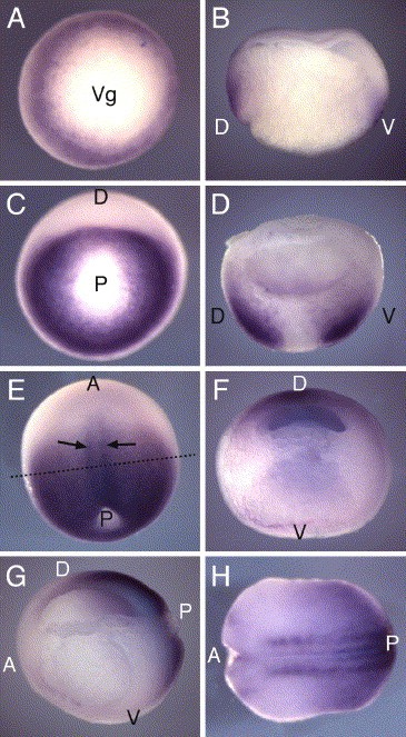 Fig. 3. In situ hybridization analysis of fullback RNA expression at gastrula and neurula stages. In situ hybridization was performed on intact (A,C,E,H) or bisected (B,D,F,G) albino Xenopus embryos. Dashed lines in panel (E) indicates the plane in which the embryo in (F) was cut in half. (A) Vegetal view of an early gastrula (stage 10). (B) Bisected embryo at early gastrula stage 10. (C) Posterior view of an embryo at mid-gastrula stage 11.5. (D) Embryo bisected sagittally at mid-gastrula stage 11.5. Note staining in involuted mesoderm. (E) Dorsal view of an embryo at early neurula stage 13. Arrows indicates stripes of staining on the dorsal side and dashed line indicates plane of section of embryo in (F). (F) Bisected embryo at early neurula stage 13. (G) Embryos bisected sagittally at early neurula stage 13. Note posterior staining. (H) Dorsal view of an embryo at late neurula stage 18. For all images, Vg, vegetal; D, dorsal; V, ventral; A, anterior; P, posterior.