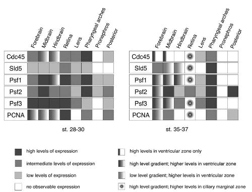 expression of Psf1. (C) Stage 33 embryo. The bracket demarcates the right half of the CNS, and the left margin of the bracket aligns with the inner boundary of