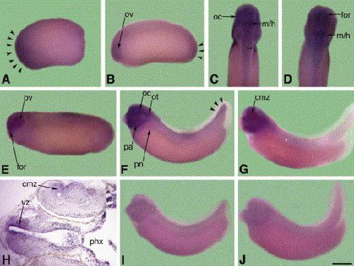 Fig. 5. Expression of Psf3. All embryos are oriented anterior to the left and dorsal to the top, except those in (C and D) which are dorsal views oriented anterior to the top. (A) Stage 13 embryo. Arrowheads demarcate anterior and posterior regions of neural expression. (B) Stage 22 embryo. (C) Stage 32 embryo. The bracket demarcates the right half of the CNS, and the left margin of the bracket aligns with the inner boundary of the ventricular zone. (D) Stage 37 embryo. (E) Stage 26 embryo. (F) Stage 32 embryo. (G) Stage 37 embryo. (H) Section through a stage 37 embryo at the level of the hindbrain, with the dorsum oriented to the left. Note the consistent levels of expression in the dorsal CNS compared to Psf1 (Fig. 3H) and Psf2 (Fig. 4I). (I) Sense control stage 30 embryo. (J) Sense control stage 37 embryo. All labels follow that listed in the legend to Fig. 1. The scale bar in G equals 380 mm in (A), 550 mm in (B) and (EâG), (IâJ), 200 mm in (C and D), and 125 mm in (H). |