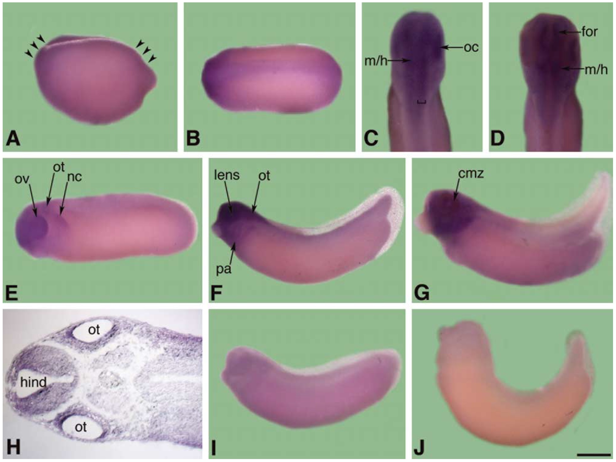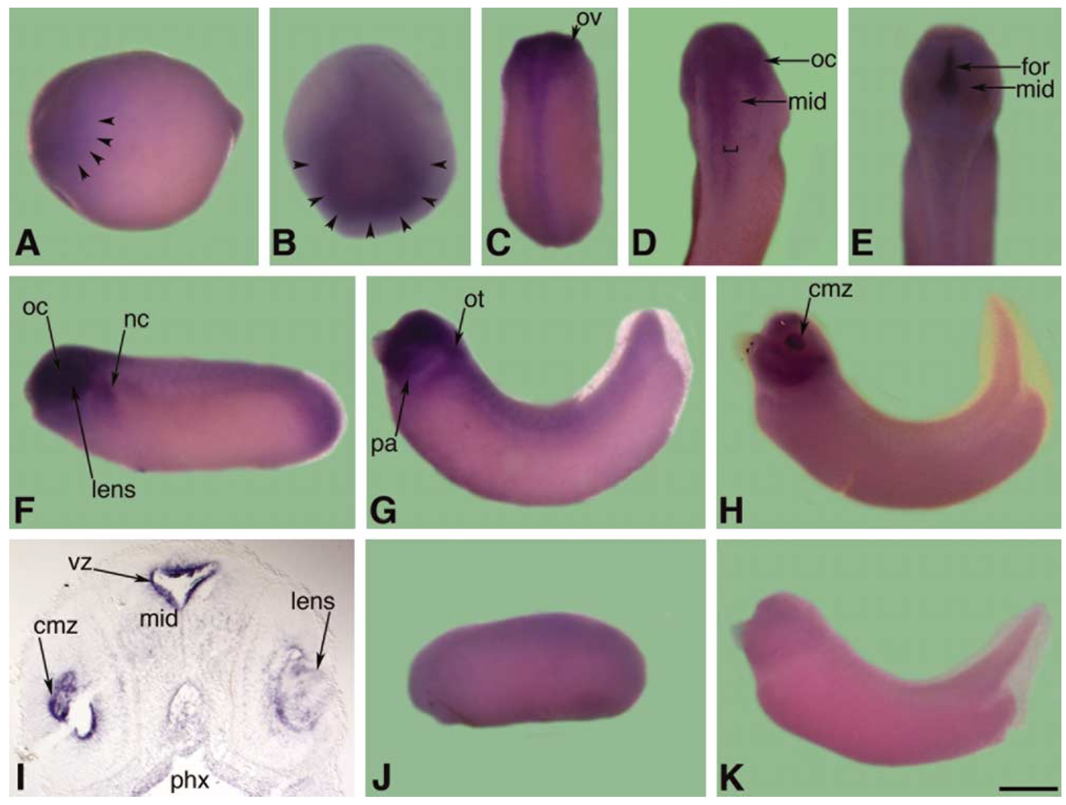 of the CNS. Expression can also be seen in the lens, the lining of the pharynx, and the ciliary marginal zone of the retina. (I) Sense control stage 33 embryo. (J)
