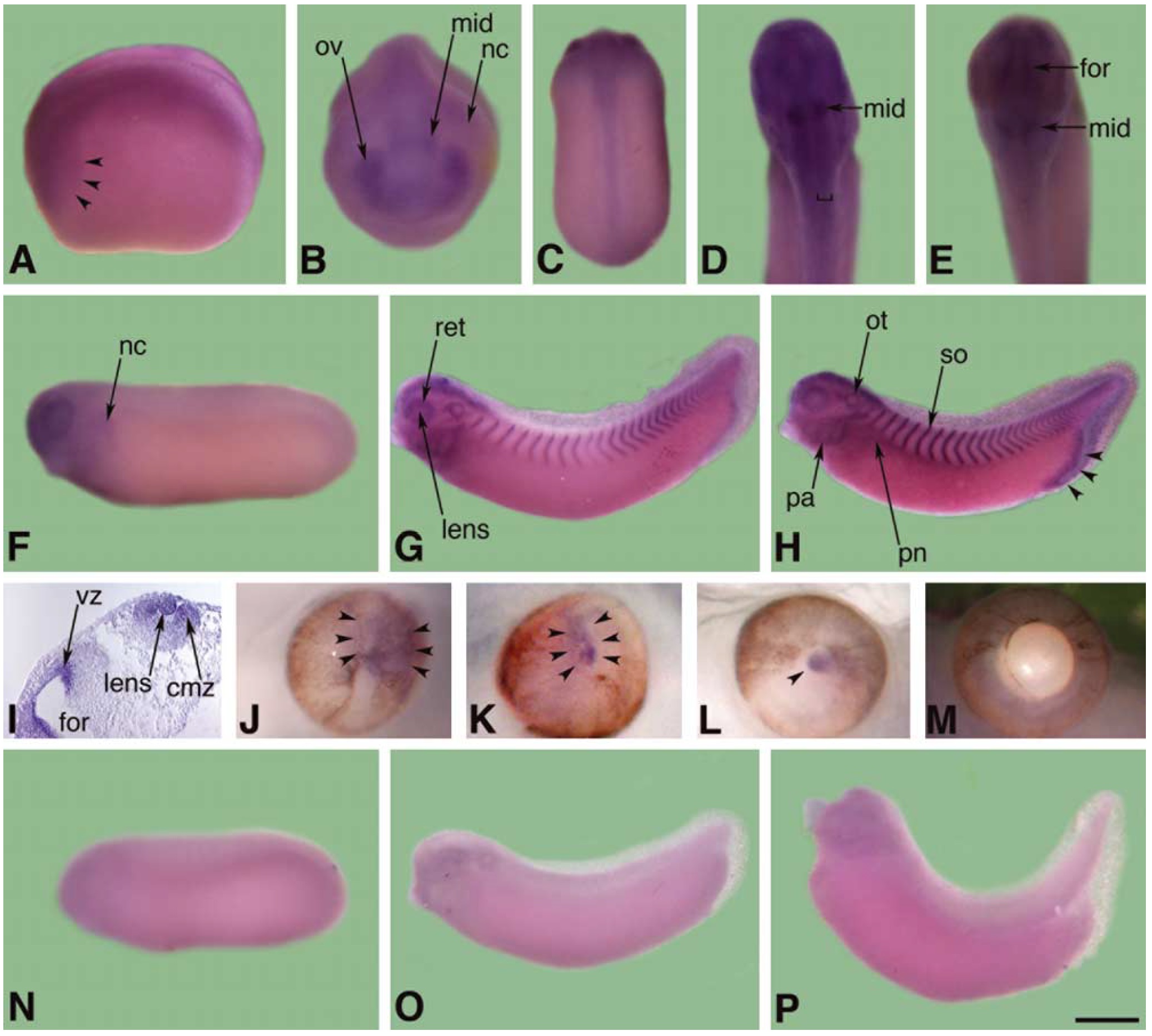 Psf2 expression in the cornea overlying the pupillary space three days after lens-ectomy. This stain does not appear directly over the pupillary space due to the differential contractions of the eye muscles resultant from the fixation process. (K and L) Expression six days after lens-ectomy, localized within the newly forming lens vesicle. (M) Undisturbed, control eye showing no detectable expression of Psf2 in the cornea. (N) Sense control stage 23 embryo. (O) Sense control stage 31 embryo. (P) Sense control stage 37 embryo so: somites. All other labels follow that listed in the legends to Figs. 1â3. The scale bar in (M) equals 380 mm in (A and B), 760 mm in (C), 200 mm in (D and E), 550 mm in (FâH), (NâP), 240 mm in (I), and 400 mm in (JâM). |