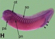 boundary of the ventricular zone. Note the gradient of expression in the CNS. (E) Stage 37 embryo, dorsal view, anterior toward the top. Intense stain is located