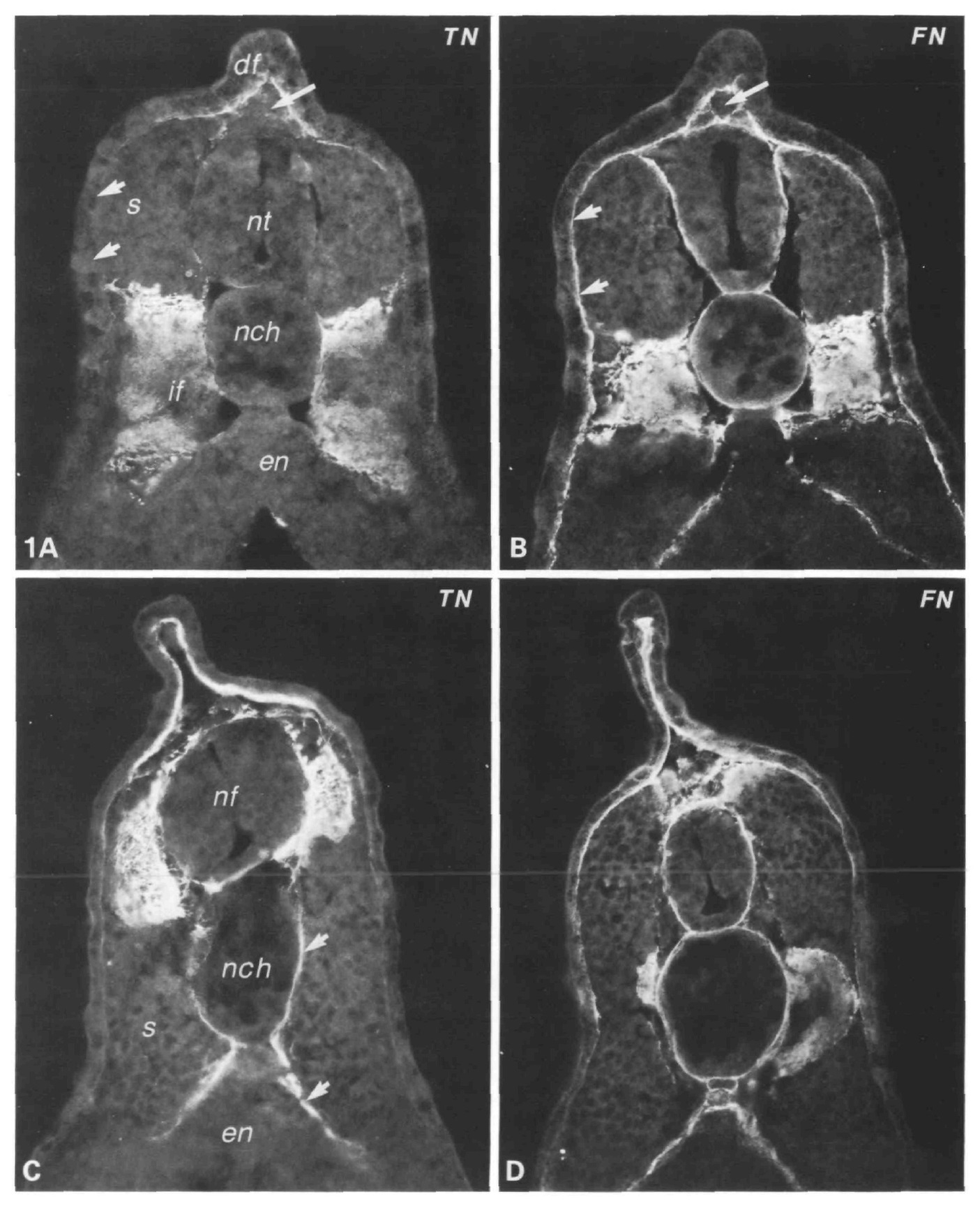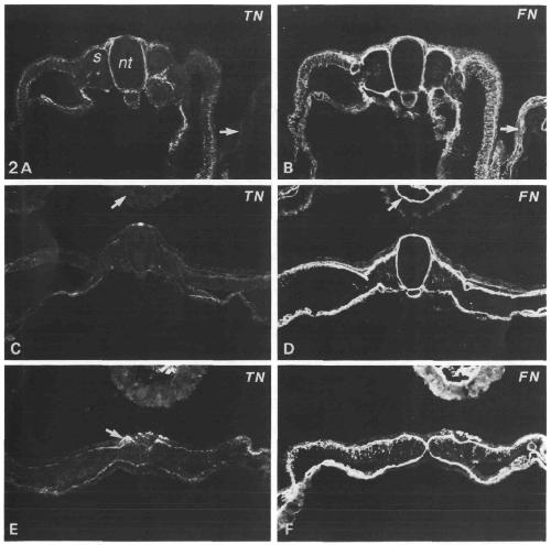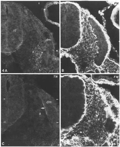 (TN) and fibronectin (FN). See small arrows in Fig. 4 for orientation. (A) In frontal sections through the dorsal part of