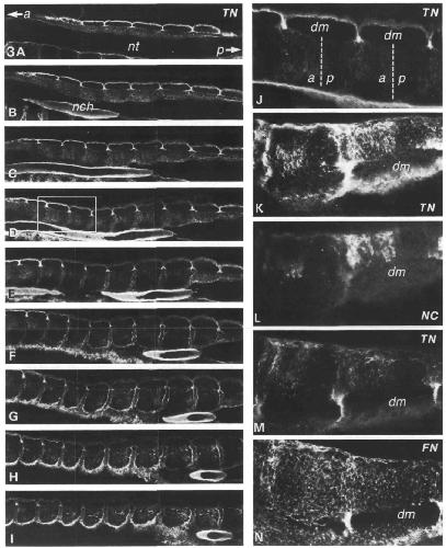 the medial surface of the somites, arrows), anti-tenascin stains the ECM of the dorsal fin, intersomitic furrows and