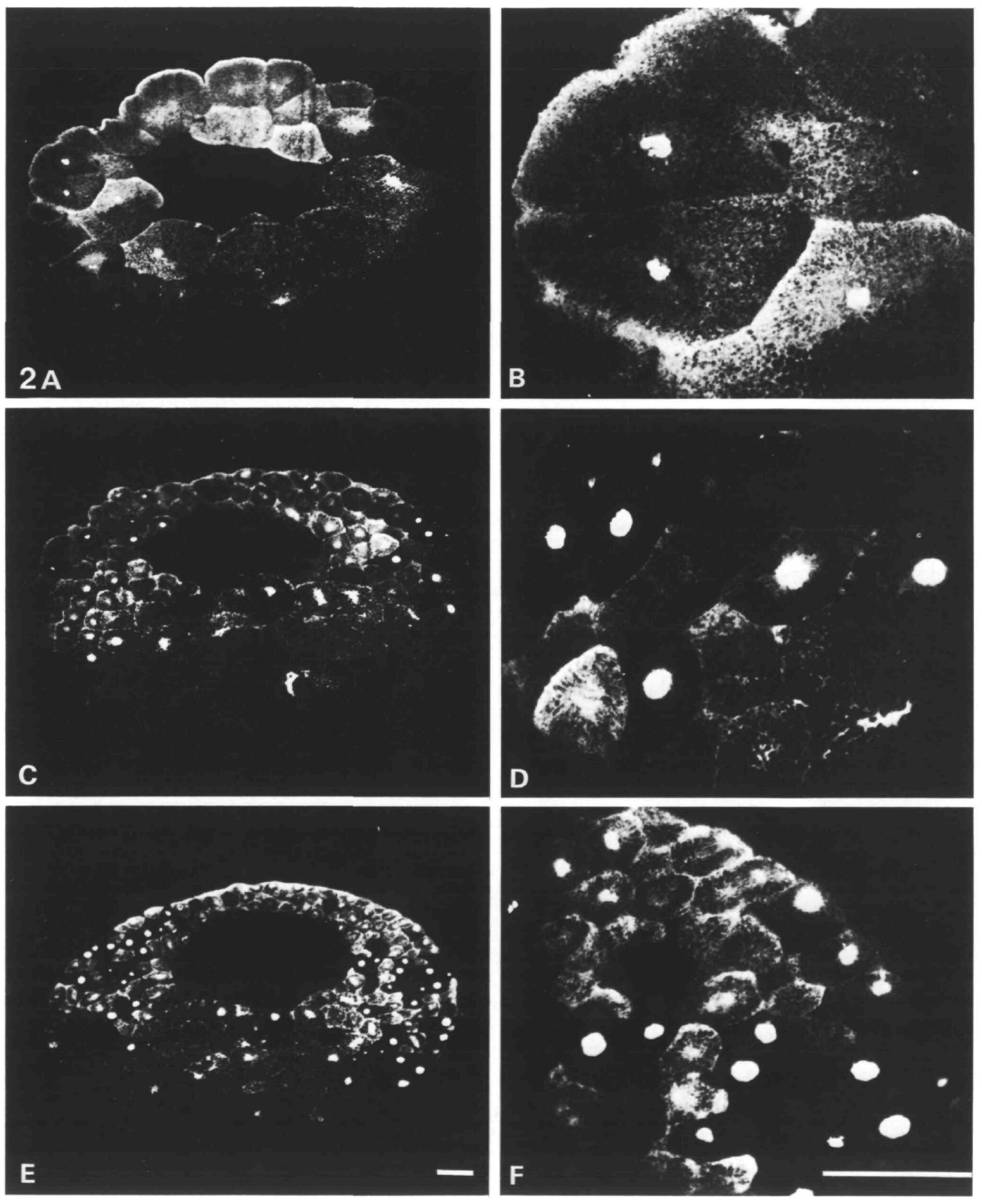(E). Counterstaining of the same sections with DAPI is shown in the right panels (B,D,F). Bar 50m. |