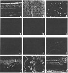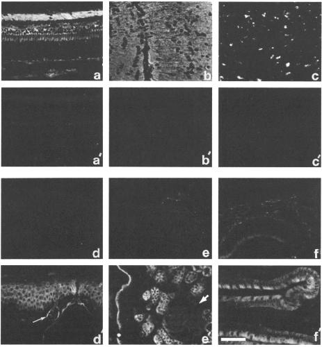 Figure 7. Adult Xenopus organs. Staining pattern of polyclonal antibodies directed against N-CAM (a-f) and L-CAM (a'-f'). Retina (a,
