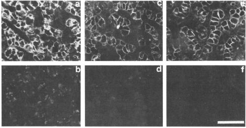 while L-CAM appears to be more diffuse in the cytoplasm. (e) Control staining with normal rabbit serum. (f) Phase contrast.