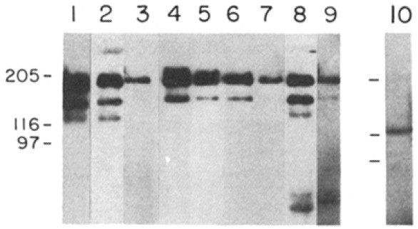 Molecular mass markers are at 205, 116, and 97 kD, respectively.