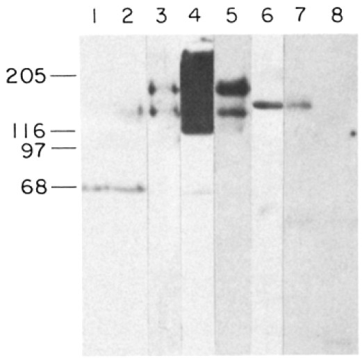 Molecular mass markers are at 205, 116, 97, and 68 kD, respectively