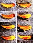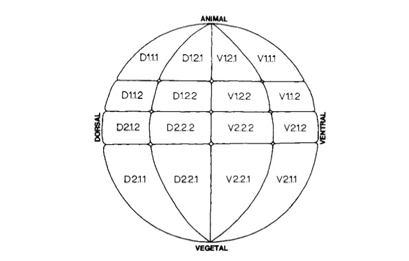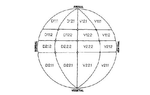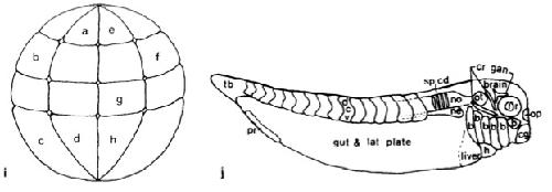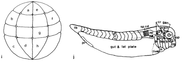 FIG 2 ( continued) (i) A diagram of the 32-cell-stage embryo, in the same orientation as that in Fig. 1, illustrating the position of the blastomeres that were injected to produce the embryos displayed in Figures 2a-2h. The four animal pole blastomeres often are called tier 1, the four blastomeres posterior to those tier 2, the four blastomeres posterior to those tier 3 and the four vegetal pole blastomeres tier 4. (j) A diagram of a stage 33/34 tailbud embryo in which the structures containing labeled cells in the preceding photomicrographs have been identified. Since many of these structures overlap, or are composed of very small cells, they may not be distinct at the focal plane or magnification of the photomicrograph. b, branchial arches; cg, cement gland; cr gan, cranial ganglia. Rostra1 to caudal these are trigeminal, facioacoustic, glosso- pharyngeal-vagal; dcv, dorsal, central, and ventral trunk somites. These extend rostrally, deep to the otocyst, where they are considered to be head somites; h, heart, 1, lens; ne, nephrotome. This structure extends caudally, deep to the ventral somite; no, notochord. This structure extends caudally to the tailbud (tb) and its cells are seen as vertical rods (as diagrammed); op, olfactory placode; ot, otocyst; pr, proctodeum; sp cd, spinal cord. This structure extends caudally to the tailbud (tb). Dorsal head mesenchyme is that tissue in the head, dorsal to the hranchial arches, that lies between the structures labeled in this diagram. |