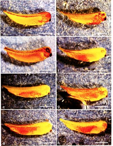FIG. 2. Stage 33/34 embryos in which a single 32-cell stage blastomere was injected with HRP. Blastomeres from different regions of the embryo (depicted in 2i) were chosen to illustrate the characteristic labeling patterns. The epidermis was removed and the entire embryo histochemically reacted. Progeny of the injected blastomere are brown. Black melanocytes surround the retina, CNS, and dorsal gut; proctodeal and cement gland cells also contain melanin pigment granules. Therefore, these structures may appear pigmented even though they do not contain HRP-labeled progeny. The locations of the organs in the tailbud embryos are depicted in 2j. Bars equal 1 mm. (a) D1.2.1. Labeled progeny populate the cement gland, olfactory placode, retina, lens, cranial ganglia, otocyst, brain and spinal cord, dorsal head mesenchyme, branchial arches, heart, head somites, central trunk somites, ventral gut, and liver. Note how different the distribution of labeled cells is compared to that of a neighboring cell shown in 2e. (b) D1.1.2. Labeled progeny populate the retina, cranial ganglia, brain and spinal cord, dorsal head mesenchyme, branchial arches, heart, notochord, head somites, and central trunk somites. The progeny distribution is distinct from that of the other dorsal animal pole blastomere (2a) and very different from the other tier 2 blastomere (2f). (c) D2.1.1. Labeled progeny in this specimen populate one branchial arch, heart, liver, and gut. The distribution of its progeny is different from that of a neighbor cell in the same tier (Zd). (d) D2.2.1. Labeled progeny in this specimen populate spinal cord, trunk somites, nephrotome, lateral plate, and gut. Many of the labeled structures lie deep to other labeled structures and thus are not distinctly identifiable at the focal plane of the photomicrograph (e.g., spinal cord, archenteron roof, nephrotome). The distribution of the progeny of D2.2.1 is distinctly different from those of its two tier 4 neighbors (2~ and 2h). (e) V1.2.1. Labeled progeny in this specimen populate the cement gland, olfactory placode, lens, three distinct cranial ganglia (rostra1 to caudal: V, VII, IX/X), otocyst, dorsal brain, dorsal spinal cord, branchial arches, heart, a few cells in the trunk somites, nephrotome, rostra1 lateral plate, liver, and ventral gut. The distribution of its progeny is very different from that of its neighbor (2a) and from that of the other ventral animal pole blastomere (2f). (f) V1.1.2. Labeled progeny in this specimen populate caudal trunk and tail structures. Those that can be clearly identified in the photomicrograph are dorsal and ventral trunk somite, lateral plate mesoderm, ventral gut, and proctodeum. (g) V2.2.2. Labeled progeny in this specimen populate cranial ganglia, otocyst, dorsal CNS, dorsal head mesenchyme, branchial arches, somites, nephrotome, lateral plate, gut, and proctodeum. The distribution of its progeny is distinct from that of its sister cell (2h). (h) Labeled progeny in this specimen can most clearly be identified in ventral tail somite, nephrotome, lateral plate, gut, and proctodeum. |