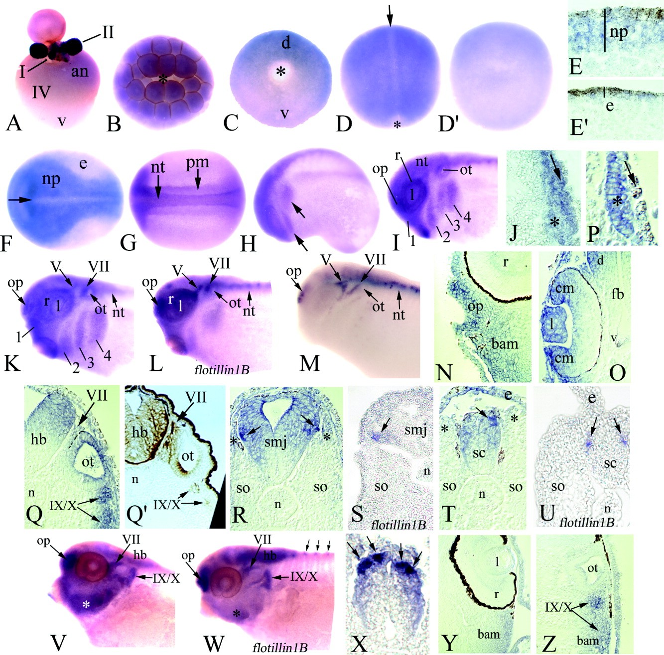 Figure 3. Whole-mount in situ hybridization. A: Oocytes contain flotillin1 transcripts throughout the cytoplasm at stages I and II. By stage IV, transcripts are only detected in the animal hemisphere (an) by in situ hybridization. v, vegetal pole. B: In 64-cell embryos, flotillin1 transcripts are abundant in the animal hemisphere (asterisk denotes animal pole). C: At gastrula stage 12.5, flotillin1 transcripts are detected throughout the embryonic ectoderm, but not in the vegetal yolk plug (asterisk). There is a slight enrichment on the dorsal (d) side. v, ventral side. D,D prime : Stage 14 dorsal view, with anterior to the top; flotillin1 expression is enhanced in the dorsal, presumptive neural ectoderm (D) compared with the ventral, presumptive epidermal ectoderm of same embryo (D prime ). Arrow points to dorsal midline. E,E prime : At stage 15, flotillin1 expression is enhanced in the thickened neural plate (E, np) compared with the ventral epidermis (E prime , e) in the same tissue section (same magnification). F: At stage 16/17, flotillin1 expression is enhanced in the neural plate (np) compared with epidermis (e). Arrow points to dorsal midline. G: At stage 19/20, flotillin1 is detected throughout the length of the neural tube (nt) and in the paraxial mesoderm (pm; dorsal view). H: At stage 21/22, there is additional expression in the branchial arches (arrows; side view). I: At stage 25/26, staining is detected in lens (l), neural tube (nt), olfactory placode (op), otocyst (ot), retina (r), and branchial arches 1-4. J: Tissue section of stage 25 just posterior to otocyst demonstrates expression in ectoderm overlying branchial arch 4, including pigmented superficial layer (arrow) and thickened sensorial layer (asterisk) of the placode. K: Stage 31 side view using flotillin1A probe. l, lens; nt, neural tube, op, olfactory placode, ot, otocyst; r, retina; branchial arches, 1-4; and cranial ganglia (V, VII). L: Stage 31 side view using flotillin1B probe. M: Stage 31 side view using n-tubulin probe to confirm neural identity of olfactory pit (op) and cranial ganglia (V, VII). N: Stage 32/33 (sagittal section), showing flotillin1 staining in olfactory pit (op) and underlying branchial arch 1 mesenchyme (bam). r, central retina is unstained. O: Stage 32/33 (transverse section) flotillin1 staining is in the ciliary margin (cm) but not central region of the retina, lens (l), and dorsal (d) but not ventral (v) forebrain (fb). P: Stage 32/33 ectoderm overlying branchial arch 4. Staining is reduced in the pigmented superficial layer (arrow) but intense in the thickened sensorial layer (asterisk) of the placode. Q: Stage 32/33 dorsal hindbrain (hb), otocyst (ot), and cranial ganglia (VII, IX/X) are stained. Note lack of staining in the notochord (n). Q prime : Tissue section at comparable level stained with an anti-N-Tubulin antibody confirms the identity of the two cranial ganglia. R: Stage 32/33 dorsal neural tube at the spinomedullary junction (smj) is stained for flotillin1A expression. Arrows indicate intensified staining in dorsolateral primary neurons. Note staining in the dorsal part (asterisks) of somite (so) but not in notochord (n). S: Stage 32/33 dorsal neural tube at the spinomedullary junction (smj) stained for flotillin1B. A restricted dorsolateral region is stained (arrow), but there is no staining in the somite (so). T: Midtrunk level of stage 33/34 shows flotillin1A expression in dorsal spinal cord (sc), dorsal part (asterisks) of somite (so) and dorsal fin epidermis (e). Arrow denotes enhanced staining in two dorsal primary neurons. U: At comparable level and stage, flotillin 1B expression (arrows) is detected only in dorsal spinal cord (sc). V: Stage 39/40 side view using flotillin1A probe. Staining is apparent in the olfactory pit (op), hindbrain (hb), cranial ganglia (VII, IX/X), and branchial tissues (asterisk).W: Stage 39/40 side view using flotillin1B probe. Staining is apparent in the olfactory pit (op), hindbrain (hb), cranial ganglia (VII, IX/X), dorsal primary neurons (small arrows), and only faint staining in distal branchial tissues (asterisk).X: Stage 35/36 dorsal primary spinal neurons (arrows) are prominently stained with flotillin1A probe. Y: Stage 39/40 staining of flotillin 1A in lens (l) and retina (r) is dramatically reduced, whereas branchial arch 1 mesenchyme (bam) staining persists. Z: Stage 39/40 staining of flotillin 1A in the otocyst (ot) is dramatically reduced, whereas cranial ganglion (IX/X) and branchial arch 4 mesenchyme (bam) staining (arrows) persists. |