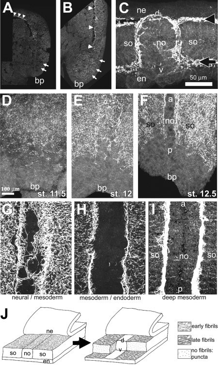 only the neural/mesoderm boundary (G) or the mesoderm/endoderm boundary (H) show distinct fibrils, whereas a projection of confocal sections through the middle of the mesoderm (shown overexposed in I) show fibrils at the lateral walls of the notochord (no) and small fibronectin-rich puncta within the somitic mesoderm (so). J: Ontogeny of the fibrillar fibronectin matrix. A ut-awaytransverse view of fibrillar fibronectin matrix assembly from mid- to late-gastrula stages. bp, blastopore; ne, neural ectoderm; en, endoderm; a, anterior; p, posterior. [Color figure can be viewed in the online issue, which is available at www.interscience.wiley.com.]