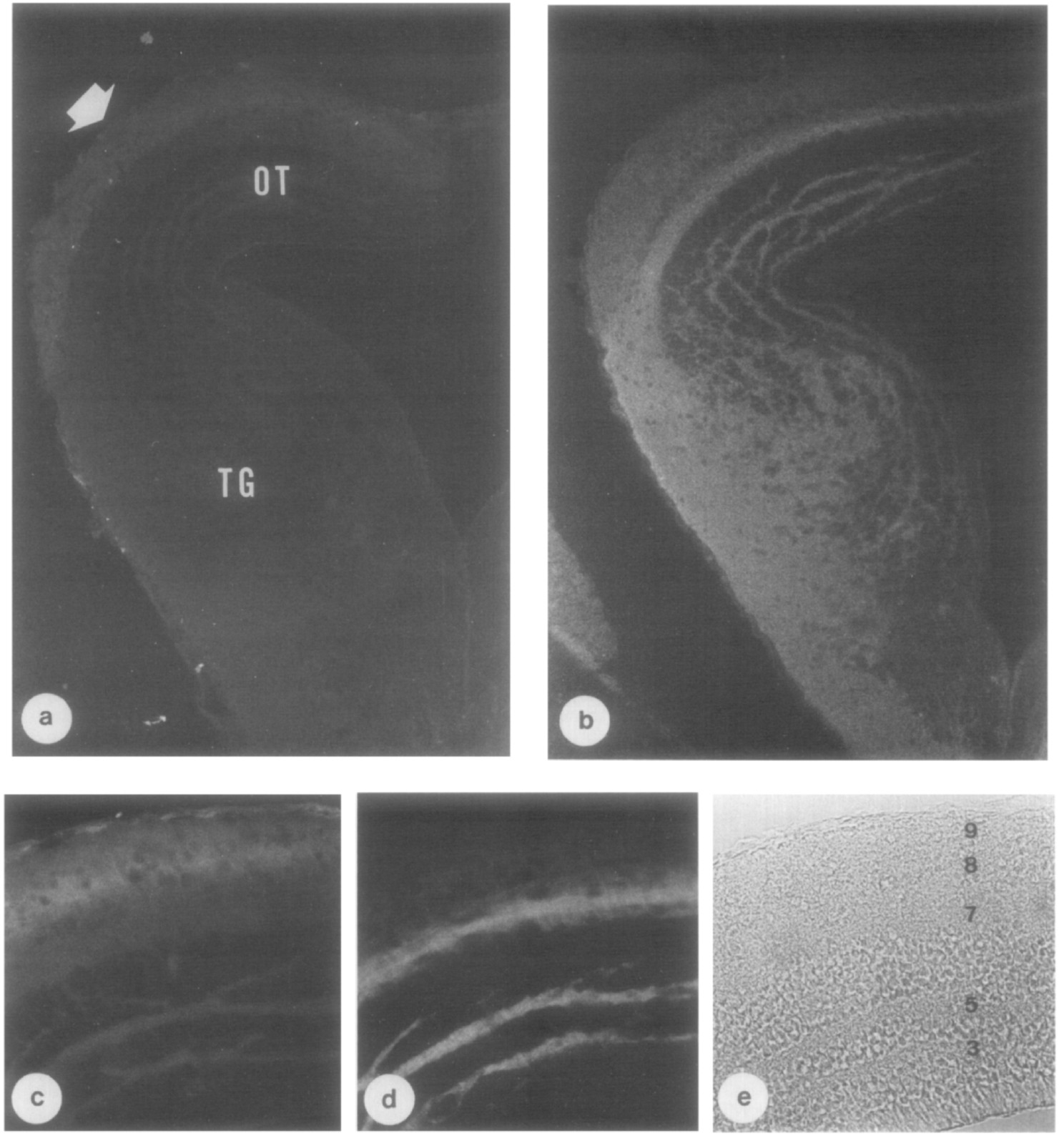 stained. (c) Immunofluorescence with MAb-A5 in the optic tectum is restricted to the 8th and 9th plexiform layers (X160). (d) The section next