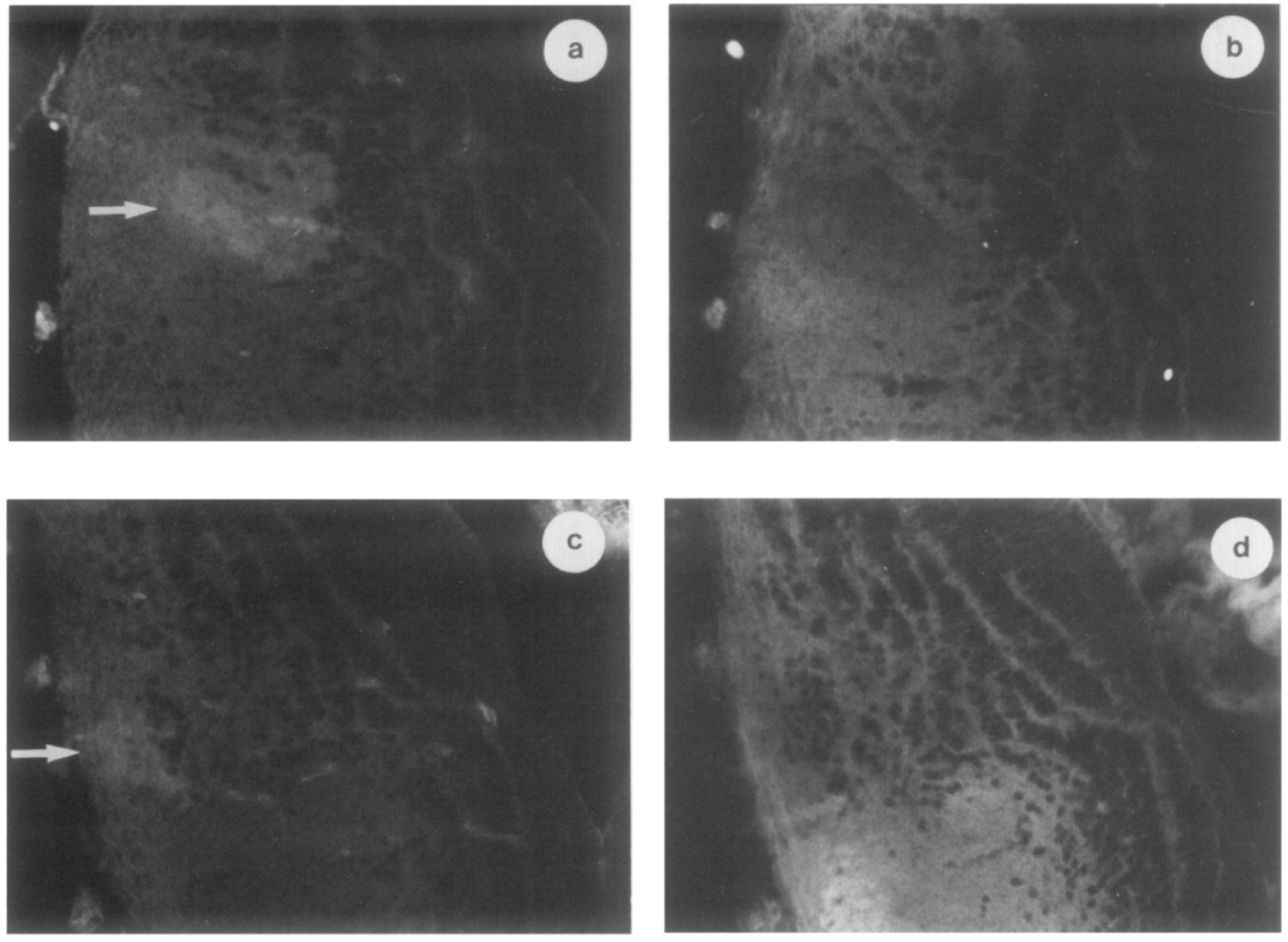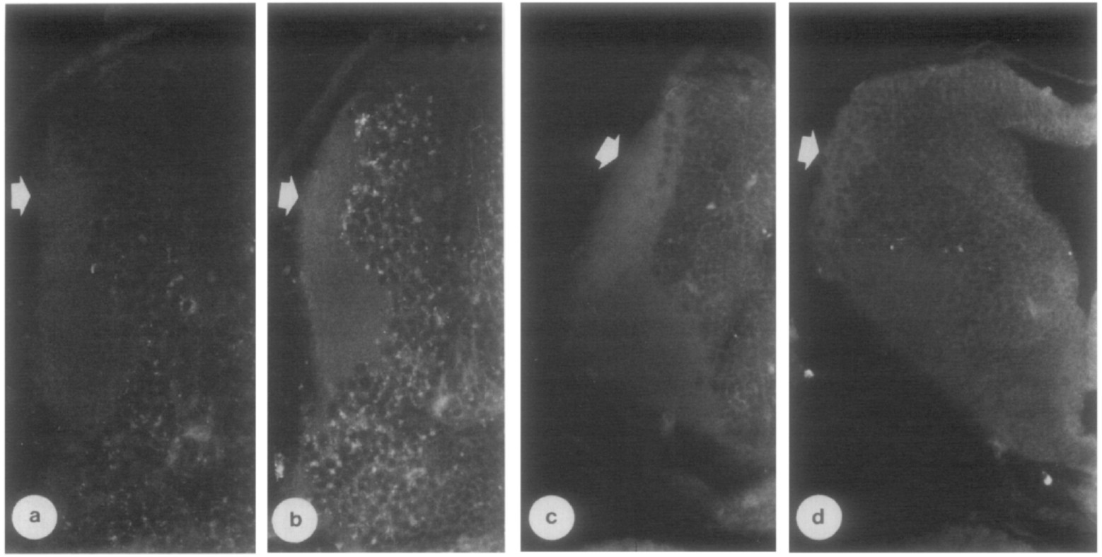 FIG. 6. Indirect immunofluorescence of MAb-A5 in the mesencephalic region in development. (a) A section of the rostra1 part of the optic