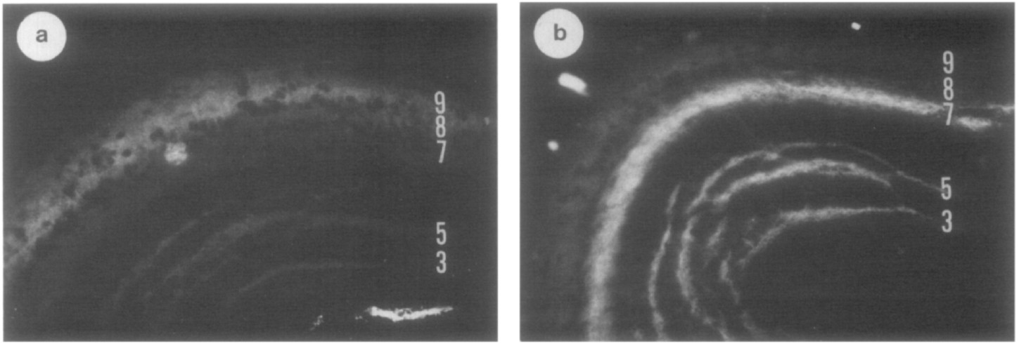 FIG. 7. Immunofluorescent staining of viable tadpole brains with MAb-A5 (a) and MAb-B2 (b) (stage 53). Numbers indicate the 3rd, 5th, 7th,