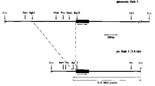FIG. 1. Restriction map of the genomic recombinant clone and the pcXeb 1 cDNA clone. The Xebl cDNA was isolated from a gtl0 phage library of stage 12 Xenopus laevis embryos. The black box indicates the region homologous to the Drosophila homoeo-box (Carrasco et al., 1984). The direction of transcription is from left to right (arrow). The arrows in both directions in the lower diagram indicate the 900~bp BgiII-EcoRI fragment which was used to produce single-stranded RNA probes.