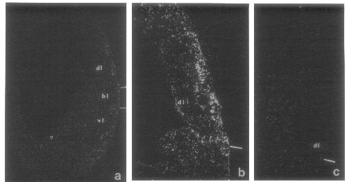 FIG. 3. In situ hybridization localization of Xebl transcript accumulation in gastrulae [st. 12 (Nieuwkoop and Faber, 1956)]. (a) Darkfield photo of in situ hybridization of a sagittal section of a stage 12 gastrula. A 900-bp [%]UTP-labeled RNA probe complimentary to the Xebl coding strand transcript was employed. This section shows both the dorsal and ventral regions around the blastopore (bl). The bars mark the edges of the blastopore. Label can be observed in the dorsal lip (dl) region, but not in the ventral lip (vl) region. 17X magnification of a 40-day exposure. (h) Higher magnification view (66X) of (a), showing label in a limited region of the dorsal lip (IO-day exposure). (c) Section hybridized with the opposite strand (sense probe). No signal could be detected in the dl cells after 40 days exposure. 66x magnification.
