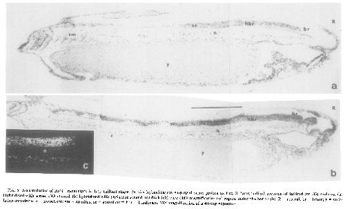 FIG. 6. Restriction of Xebl transcripts to the cervical spinal cord of the swimming tadpole. In silu hybridization (using same probes as Fig. 3) of longitudinal sections of stage 41 larvae. (a) Hybridized with sense RNA strand (control); (b, c) hybridized with antisense strand. (c) Higher magnification (80X) of spinal cord region of (b). Exposed for 40 days. R = rostral; br = brain; y = yolk-laden endoderm; SC = spinal cord; IV = 4th ventricle of brain; hbr = hindbrain; m = mesoderm; n = notochord; sm = somites; p = pharynx.