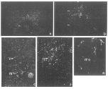 FIG. 7. Transcript accumulation in the adult spinal cord. Darkfield photographs of transverse sections of the adult spinal cord. (a) and (b) Are at low magnification (9X), lshowing the entire spinal cord. (c) and (d) Are at higher magnification (47x), showing a detail focused on the left half of the gray matter. Tissue was dissected from an adult female and fixed in methanol, as described for embryos. Likewise, in situ hybridization was carried out in the same way as described for embryos. (a) and (c) Represent controls stained with Giemsa and photographed in darkfield to show cellular details of the sections. In the ventral horn the large motoneurons (m) can be identified. The rest of the gray matter shows groups of neurons (n, with pointers) with different shapes. (b) Shows a section adjacent to (a) hybridized with the Xeb1 antisense probe in the same way as was performed in embryo sections, and exposed for 40 days. Brackets show the region which is magnified in (d). (d) shows the bracketed region, enlarged from (b), of half of the spinal cord gray matter. Groups of neurons (n, pointers) display signal in the lateral field [compare (d) with (e) to localize the cell position in the same half of the spinal cord). (e) Represents a section through the medulla oblongata hybridized concomitantly with the section shown in (a). No signal can be observed in the section.