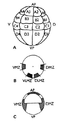 Fig. 1. (A) Nomenclature of blastomeres at the 32-cell stage. D, dorsal; V, ventral; AP, animal pole; VP, vegetal pole. (B) Orthotopic grafts at stage 10 viewed from vegetal pole. (C) Orthotopic grafts viewed in median section. AP, animal pole; VP, vegetal pole; DMZ, dorsal marginal zone; DLMZ, dorsolateral marginal zone; VLMZ, ventrolateral marginal zone; VMZ, ventral marginal zone.