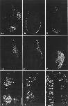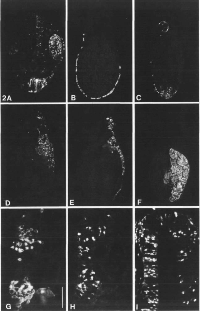 Fig. 2. Examples of actual cases. All photographs show bright fluorescence of FDA-labelled cells against a faint autofluorescent background. (A) A l blastomere, showing label in brain, retina and sucker, with contralateral contributions. (B) A4 blastomere, midtrunk level showing label confined to epidermis. (C) Cl blastomere, anterior trunk, showing label in notochord and endoderm. (D) C3 blastomere, showing label in pronephros, ventral somite and trunk mesenchyme (probably sclerotome). (E) C4 blastomere, posterior level, showing label in lateral plate and originally ventral,somite. (F) D3 blastomere, showing sharp boundaries between endoderm and mesoderm and along first cleavage plane. (G) C3 blastomere, showing how dorsal convergence of ventral somite yields separate patches of cells. Bar, 60/an. (H) B3 blastomere, showing short-range cell mixing in somite. Magnification as G.