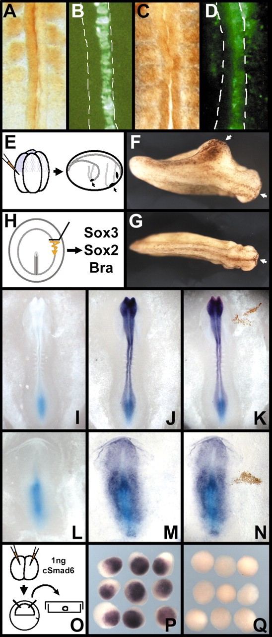 Fig. 1. Smad6 does not induce neural markers in the chick. (A-G) Experiments to test the activity of Smad6. Smad6-IRES-GFP was electroporated into one half of the chick neural tube (A,B). Staining against phospho-Smad1 (A) reveals that activation of Smad1 has been inhibited in the electroporated cells (green in B), while in control GFP electroporated embryos (C,D) phospho-Smad1 is not altered (C). cSmad6 injection into the marginal zone in Xenopus (E) induces a secondary axis (F), while GFP-injected controls appear normal (G). (H-N) Smad6 does not induce neural markers. Electroporation of Smad6 into competent area opaca epiblast at stage 3+ (H) does not induce Brachyury (I,L; light blue), Sox2 (J) or Sox3 (M) (purple). In this and subsequent figures, electroporated cells were visualized by staining with anti-GFP antibody (K, N; brown). (O-Q) Positive controls. cSmad6 or GFP was injected at the two-cell stage and animal caps isolated at early gastrula (O). Smad6 (P) can neuralize animal caps, while GFP cannot (Q), as assessed by Sox3 expression.