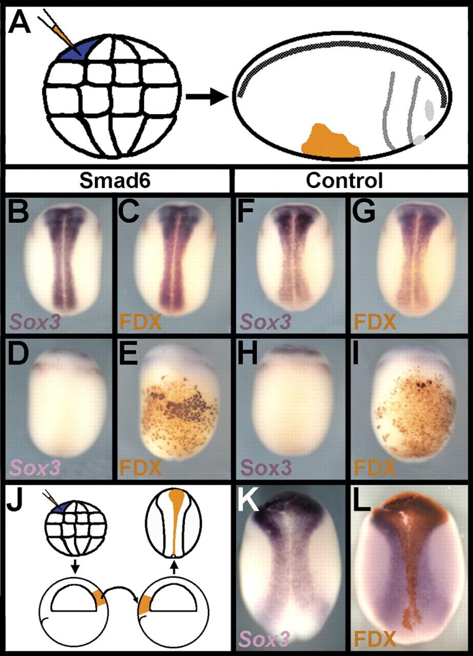 Fig. 6. BMP inhibition by Smad6 is not sufficient for neural induction in Xenopus ventralepidermis. (A-I) cSmad6 was targeted to the ventralepidermis by injection into the A4 blastomere of 32-cell stage embryos (A). Smad6 does not activate Sox3 expression (B-E), compare with GFP-injected control embryos (F-I). B,C,F,G are dorsal views; D,E,H,I are ventral views of the embryos in B,C,F,G. C,E,G,I show the embryos in B,D,F,H after staining with anti-fluorescein to reveal the lineage tracer FDX which was co-injected with the mRNA. (J-L) To test that the progeny of the A4 blastomere is competent to respond to neural inducing signals from the organizer, a lineage tracer (FDX) was injected into the A4 blastomere. At late blastula/early gastrula stage, the labelled cells are transplanted into the dorsal side of an unlabelled host embryo, which is grown to early neurula stage (J). (K,L) The transplanted cells (FDX in brown in L) contribute to the neural plate and express Sox3 (purple).