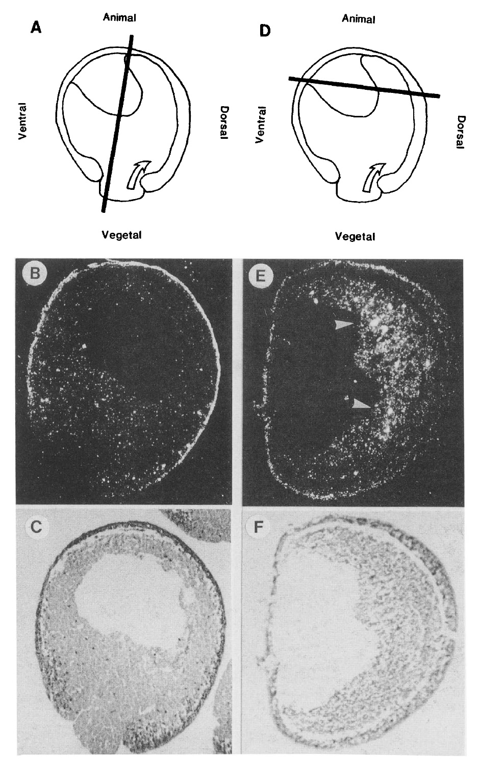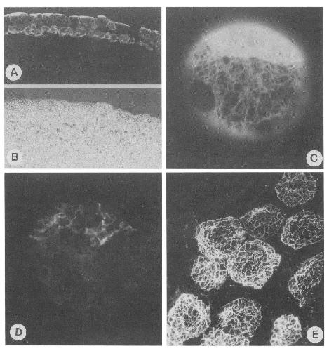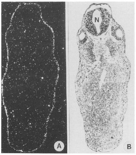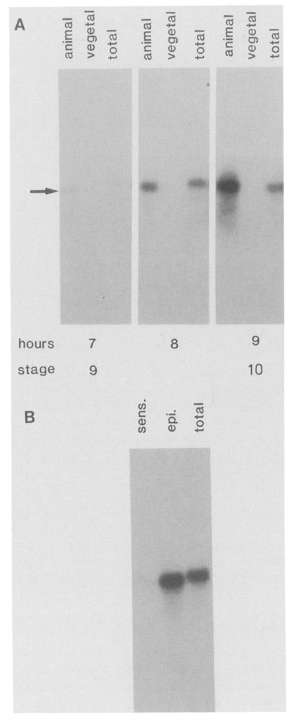 Analysis of the spatial pattern of expression of embryo-specific epidermal cytokeratin genes in Xenopus laevis shows earliest activity in the animal pole cells of stage-9 blastulae. These genes are transcribed predominantly in the epithelial or outer ectoderm, to a lesser extent in the sensorial or inner ectoderm, and at low levels if at all in other regions of the embryo. In the early gastrula the entire ectoderm, including preneural and preepidermal regions, expresses cytokeratin mRNAs; accumulation of these mRNAs in preneural cells is terminated after contact is made with involuting chordamesoderm. On the basis of this and earlier work (Sargent et al. 1986) we suggest that the pattern of expression of cytokeratin genes in frog embryogenesis is based on prelocalized components modulated by the inductive influence of involuting chordamesoderm. The cytokeratin proteins are deposited in the form of filamentous networks in both layers of the epidermis. In the epithelial layer, a much denser mesh of filaments is facing the outside of the embryo. This polarity is established at the onset of the polymerization of these filaments. Thus, intraembryonic and intracellular localization of keratin gene expression and protein deposition is established at the onset of activation of these genes.
