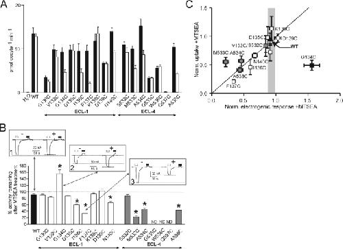 Figure 2. . Identification of functionally important sites in ECL-1 and ECL-4. (A) 32Pi uptake of WT and mutants before (filled bars) and after (unfilled bars) incubation for 10 min in 1 mM MTSEA (n ≥ 10 oocytes per group). (B) Remaining electrogenic activity (expressed as % of the initial response) after 3–5 min exposure to 1 mM MTSEA for n ≥ 3 oocytes/construct, measured at Vh = −50 mV, ND100 ± 1 mM Pi. WT response, filled bar; mutants, open bars. ND (not determined) refers to mutants that gave an electrogenic response <−15 nA or no measurable response to 1 mM Pi in at least three batches of oocytes from different donor frogs. Insets show representative recordings from three oocytes voltage clamped to −50 mV that expressed the WT (1), G134C (2), and F137C (3), respectively, before (−) and after (+) incubation for 3 min in 1 mM MTSEA. The response of each oocyte to a 20-s application of 1 mM Pi (open bars) and 1 mM PFA (filled bars) was recorded. Dotted lines indicate peak of Pi-dependent response and holding current in ND100 to aid comparison. Asterisks indicate mutants that showed statistically significant deviations from the WT, as reported by an unpaired t test (P < 0.05), applied to the normalized data. (C) Comparison of activity after MTSEA exposure for mutants for which reliable electrophysiological data was available (ECL-1, empty squares; ECL-4, gray-filled squares; WT, filled square) normalized to control (−MTSEA) condition. Vertical error bars indicate SEM for normalized uptake data, horizontal error bars indicate SEM from data in B. Gray bar represents mean ± SEM to indicate change of electrogenic activity observed for WT-expressing oocytes after MTSEA exposure. |