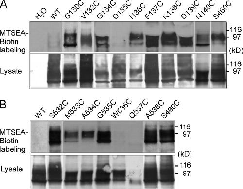 Figure 3. . Accessibility of cysteine mutants in ECL-1 (A) and ECL-4 (B) by MTSEA-Biotin. Western blots show streptavidin precipitates of MTSEA-biotinylated oocytes (top) and the corresponding whole cell lysates (bottom) from oocytes that expressed the indicated mutants probed with an antibody raised against the NH2 terminus of NaPi-IIa. Biotinylation data have been combined from several assays made from different batches of oocytes. In each assay, WT and water (H2O) injected oocytes were used as negative controls, and oocytes injected with cRNA coding for the mutant S460C (Lambert et al., 1999a) were used as a positive control. The band in the range 80–100 kD confirms that the labeled protein is NaPi-IIa. White lines indicate that intervening lanes have been spliced out. |