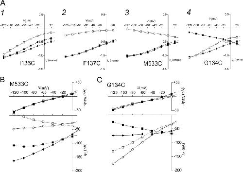 Figure 6. . Current–voltage (I–V) curves for selected mutants. (A) Mutants that showed significantly decreased electrogenic activity at −50 mV after MTSEA exposure: I136C (1), F137C (2) in ECL-1, and M533C (3) in ECL-4, before MTSEA exposure (filled squares) and after 3–5 min exposure to 1 mM MTSEA (empty squares) (n ≥ 4). G134C (4) in ECL-1 showed increased electrogenic activity at −50 mV after MTSEA exposure. Each data point is the change in holding current induced by 1 mM Pi (pH 7.4, in ND100), normalized to the magnitude of IPi at −100 mV, 1 mM Pi, before MTSEA exposure. For G134C, the data were normalized to the magnitude of IPi at −100 mV after MTSEA exposure. WT steady-state I–V data for IPi (filled circles) for WT-expressing oocytes, normalized to the magnitude of IPi at −100 mV (n = 4), are superimposed. SEMs smaller than symbol size are not shown. (B) I–V data showing the respective leak current (top) and Pi-dependent current (1 mM Pi) (bottom) for a representative oocyte that expressed M533C before (filled squares) and after (empty squares) MTSEA exposure; data points joined by dotted lines. The leak was estimated from the response to superfusion in 1 mM PFA (−IPFA). The Pi-dependent currents were leak corrected by adding the respective leak values at each test potential before MTSEA exposure (filled diamonds) and after MTSEA exposure (empty diamonds); data points joined by continuous lines. (C) I–V data showing the respective leak current (top) and Pi-dependent current (1 mM Pi) (bottom) for a representative oocyte that expressed G134C before (filled squares) and after MTSEA exposure (empty squares); data points joined by dotted lines. The Pi-dependent currents were leak corrected by adding the respective leak values at each test potential before MTSEA exposure (filled diamonds) and after MTSEA exposure (empty diamonds); data points joined by continuous lines. |