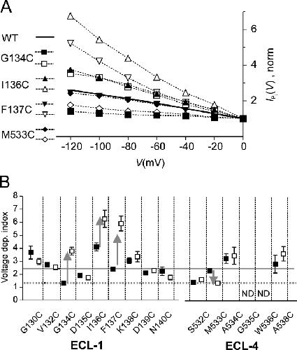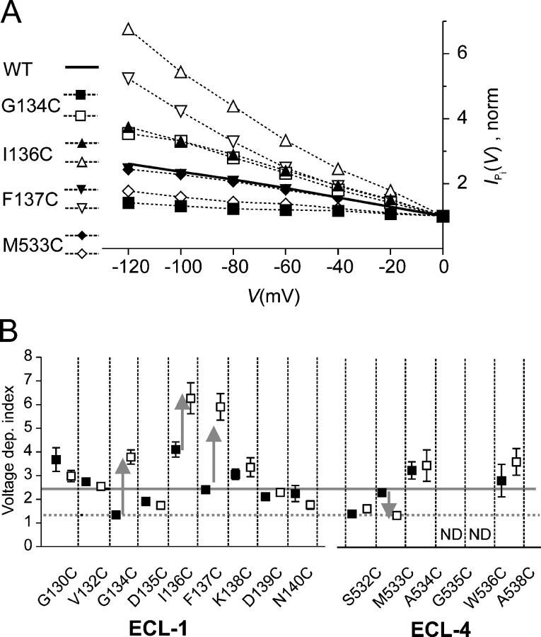 Figure 7. . Cysteine engineering at sites in ECL-1 and ECL-4 induces deviations from WT voltage dependency. (A) Voltage dependency of G134C (squares), I136C (triangles), F137C (inverted triangles), and M533C (diamonds), before (filled symbols) and after (open symbols) incubation in MTSEA (1 mM, 3 min). Pi-dependent currents, corrected for leak, were normalized to the response at 0 mV. The ordinate scale represents the relative change in IPi as a function of membrane potential. Data pooled from n > 4 cells. WT data is represented by continuous line. (B) Voltage dependency index for all functional mutants given by ratio of response to 1 mM Pi at −100 mV to that at 0 mV (100 mM Na+) before (filled squares) and after (open squares) MTS treatment (1 mM MTSEA, 3 min). Continuous reference line indicates WT index. Dotted reference line indicates that G134C-MTS, S532C ± MTS, and M533C + MTS have the same index. Arrows indicate direction of voltage dependency change for selected mutants after MTS incubation. |
