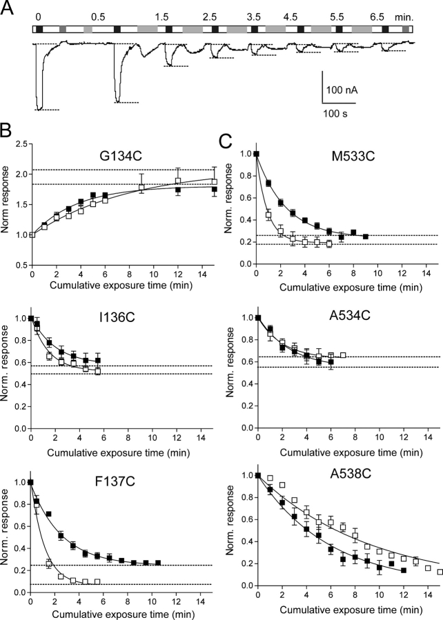 Figure 4. . Determination of MTS-Cys reaction rates for mutants that showed a change of activity after MTS exposure. (A) Representative recording of current from an oocyte that expressed mutant F137C after successive applications of MTSET (10 μM) (light gray bars). The cumulative exposure time (min) is indicated above each test response. Test substrates Pi (1 mM, black bars) and PFA (1 mM, dark gray bars) were applied for ∼20 s. (B and C) Pi-dependent currents at Vh = −50 mV, normalized to the initial value plotted as a function of cumulative MTS reagent exposure time for selected mutants in ECL-1 (B) and ECL-4 (C). Cells were exposed to either MTSEA (filled squares) or MTSET (open squares) for the cumulative time indicated and at the concentrations given in Table I. Continuous line is a fitted single exponential function with plateau (Eq. 1) from which the reaction rate and plateau were estimated. Each data point is pooled from ≥3 cells. Broken lines indicate plateau levels (IPi∞) estimated from the fit of Eq. 1 (Table I). |