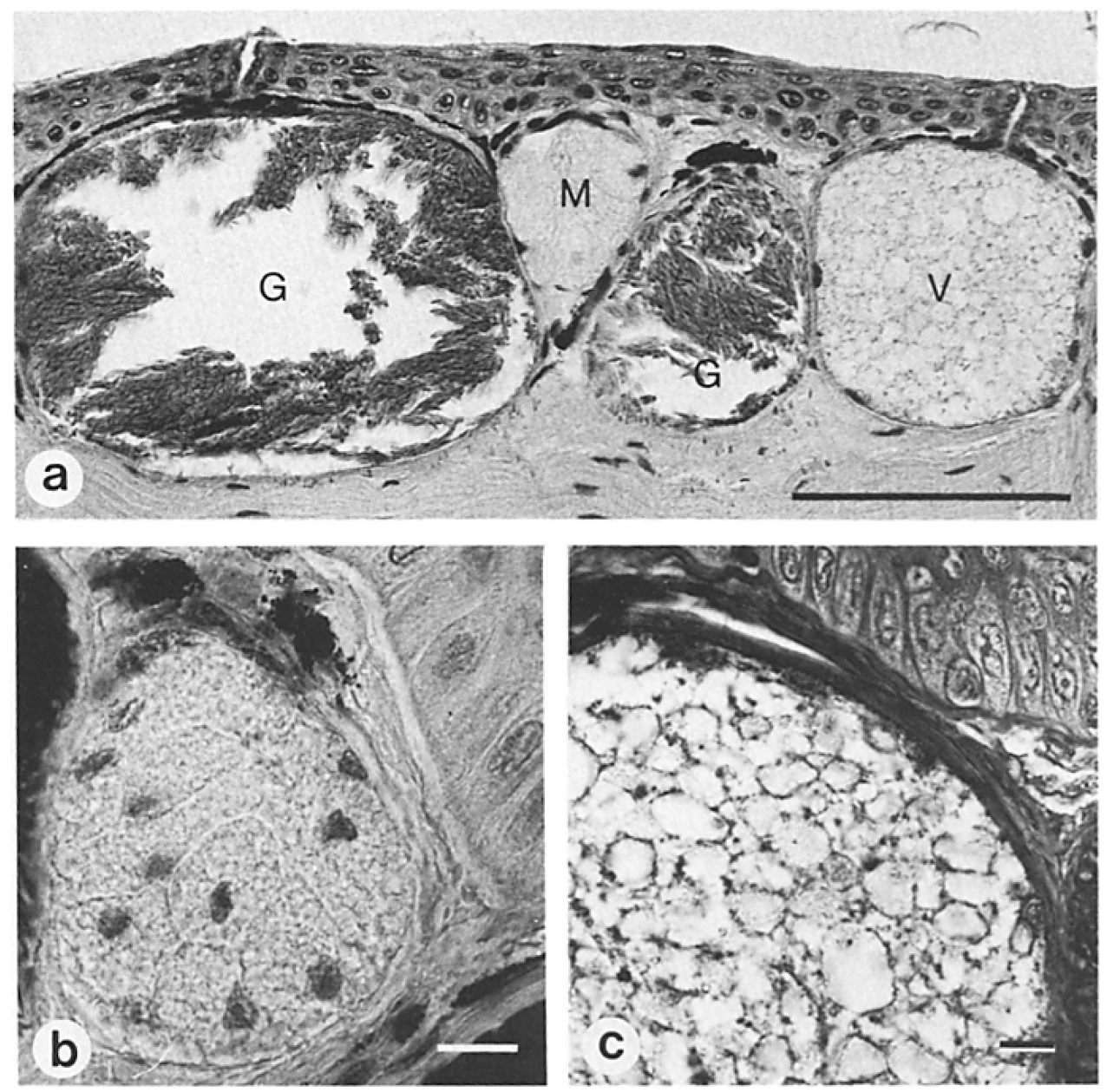 glands (G), mucous glands (M),
