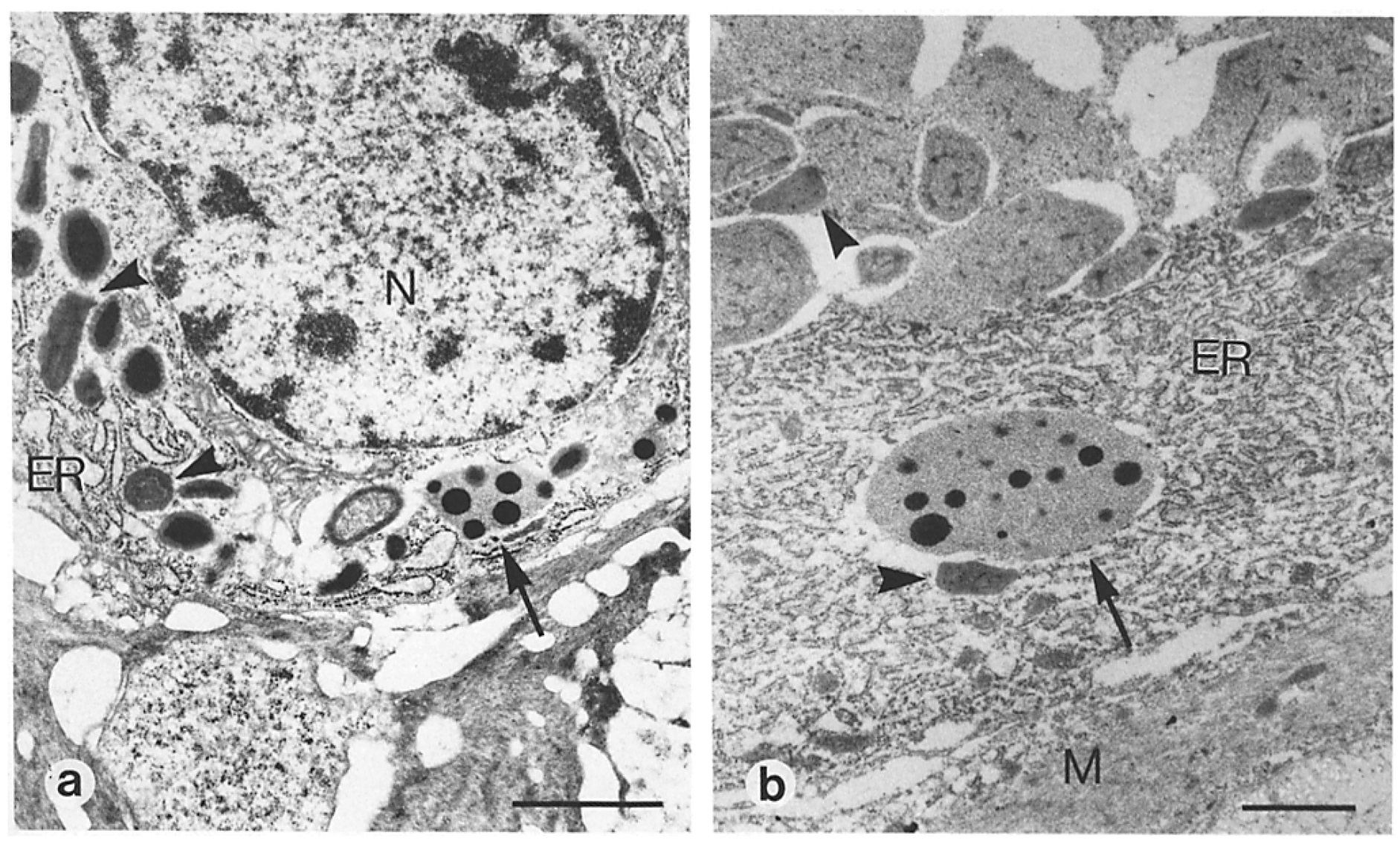(N), storage granule (G). (a) Bar, 0.5 Ixm. (b) Bar, 0.5 ~tm. |