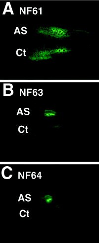 Figure 6. xlbax antisense (AS) transfection delays cotransfected green fluorescent protein (GFP) disappearance during natural metamorphosis in vivo. Stage NF55 tadpoles were cotransfected in the tailmuscle with 1 μg of peGFP-C1 and either 1 μg of a control pcDNA3 vector in the left side of the tail or a plasmid-expressing full-length xlbax AS RNA in the right side of the tail. A: Animals were photographed directly under a dissecting scope equipped with fluorescent light at different stages of metamorphosis NF61 (A), NF63 (B), and NF64 (C). Note that, as metamorphosis progresses (over 15 days), the GFP signal disappears almost totally in the control side (Ct, bottom) but is maintained in the xlbax mRNA AS-injected side. The results represent one of two independent experiments.