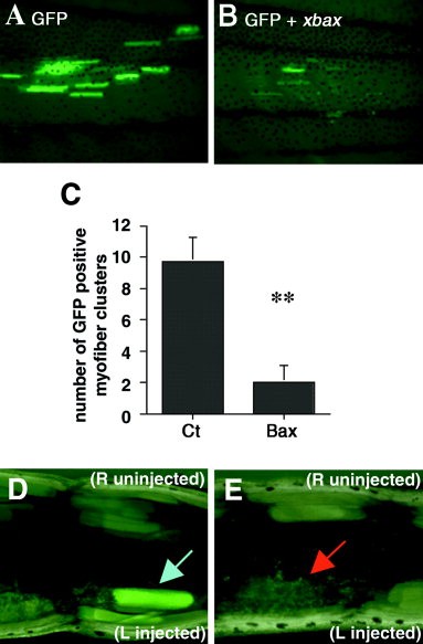Figure 4. xlbax transfection reduces expression of cotransfected green fluorescent protein (GFP) in muscle cells in vivo. Tadpoles were cotransfected in the tailmuscle with 1 μg peGFP-C1 and either 2 μg of a control plasmid vector (pcDNA3) or a plasmid-expressing xlbax (pcDNA3-xlbax). Three days later, animals were photographed directly in toto under a dissecting scope equipped with fluorescent light. A: In vivo detection of GFP expression in control-injected tadpole. B: GFP detection in tadpolemuscle injected with xlbax. Note decreased GFP expression compared with A. C: Numbers of GFP-positive myofiber clusters in control (Ct, A) and xlbax (B) -injected tadpoles. Means SEM are given; n ⥠10 in all cases; **P ⤠0.01. D,E: Longitudinal Vibratome sections of tail observed under a microscope equipped with fluorescent light. D: Section of control-injected tadpoletailmuscle. The blue arrow indicates GFP-positive myofibers. E: Section of tadpoletailmuscle injected with xlbax. No GFP-positive myofibers were observed. The red arrow indicates sites of myofibers loss. Each section shown on the figure is from one of two independent experiments providing identical results.