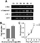 Figure 2. xlbax expression during natural and induced metamorphosis. A: Total RNA was extracted from isolated tail at different metamorphic stages and assayed by polymerase chain reaction (PCR) for the expression of xlbax, xcaspase3, and xR11 mRNAs. The internal control was Rpl8. After 30 cycles of PCR, 10 μl of the reaction were electrophoresed on 2% agarose gels and stained with ethidium bromide. In the Ct- lane, the reverse transcription product was replaced by water to check for PCR contamination. B: A more quantitative PCR procedure using 32P-labeled dCTP was carried out to compare stage NF54 and NF62. After 20 cycles of PCR, 10 μl of the reaction were electrophoresed on acrylamide gels and the results were quantified by PhosphorImager scanning. The average values SEM of three experiments are expressed as fold induction where 1 equals means for stage NF54. Moreover for each sample, densitometry readings were normalized against the value for rpl8 RNA. Statistical signification as compared with the untreated animals is expressed as **P < 0.01. C: Stage NF55 tadpoles were treated for 1 to 5 days with T3 (10 nM). Total RNA was extracted from isolated tails and assayed by PCR for the expression of xlbax mRNAs as described in B. The figure presents one of two independent experiments.