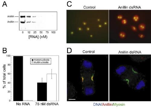 Figure 6. Depletion of anillin by dsRNA in Drosophila cells. (A) Western blot of anillin depletion at varying dsRNA concentrations. (B) Quantitation of multinucle- ate phenotype in untreated or 75 nM anillin dsRNA- treated cells. (C) Image of control or anillin dsRNA- treated cells stained for DNA and cell volume. (D) Image of Drosophila cell untreated or anillin dsRNA treated during cytokinesis stained for DNA, anillin, and myosin II. Bar, 5 um. |