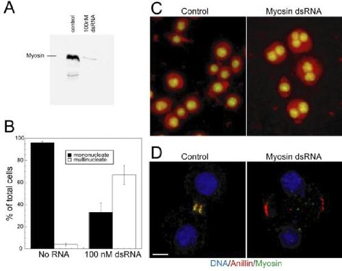 Figure 7. Depletion of myosin II by dsRNA in Drosophila cells. (A) Western blot of myosin II after control and 100 nM myosin II dsRNA treatment. (B) Quantitation of multinucle- ate phenotype in untreated or myosin II dsRNA-treated cells. (C) DNA staining of multinucleate cells in control or myosin II dsRNA-treated cells. (D) Image of control or myosin II dsRNA-treated cells during cytokinesis stained for DNA, anillin, and myosin II. Bar, 5 um. |