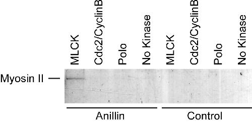 Figure 4. Anillin binds activated myosin II. Myosin II precipitation by anillin after myosin II phosphorylation by MLCK, Cdc2/CyclinB, Polo kinase, or no kinase. |