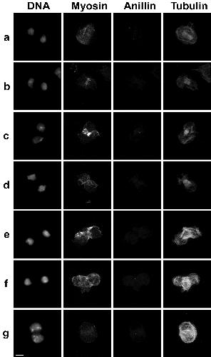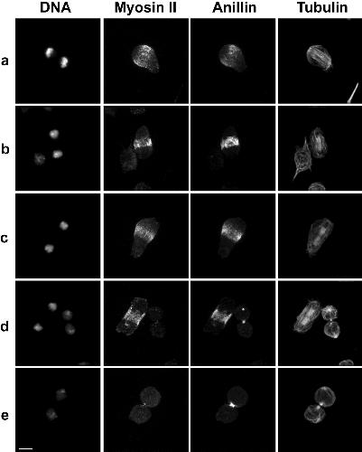 Figure S2 – Drosophila Kc167 cells fixed and stained for DNA, myosin II, anillin and tubulin during different stages of cytokinesis. Scale bar represents 5 μm. |