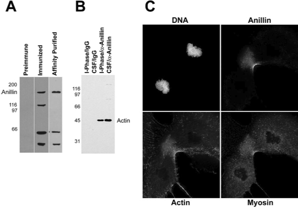 Figure 1. Characterization of X. laevis anillin. (A) Western blot of 20 ô°g of crude X. laevis egg extract with preimmune serum, immunized serum, and affinity-pu- rified antibody. (B) Coimmunoprecipitation of anillin and actin from Xenopus egg extracts. Lane 1, interphase extract precipitated with rabbit IgG; lane 2, CSF extract precipitated with IgG; lane 3, interphase extract precip- itated with anti-anillin; lane 4, CSF extract precipitated with anti-anillin. (C) immunofluorescence images XTC cells stained for DNA, anillin, actin, and myosin II. |